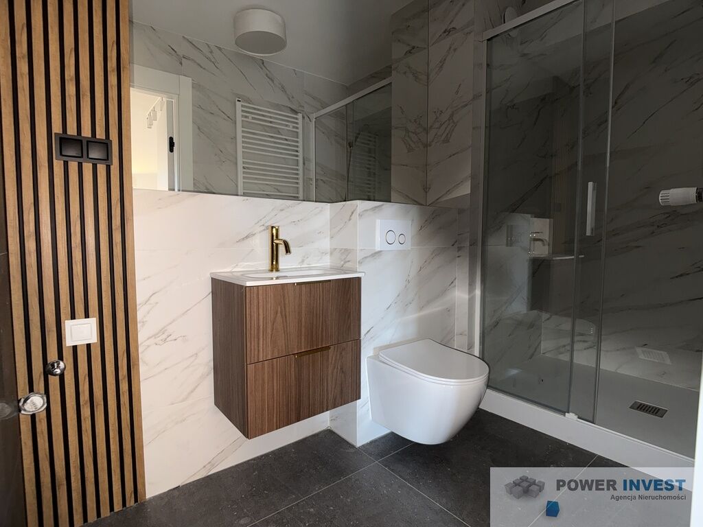 łazienka jest kompletna i wykończona w nowoczesnym standardzie. W
