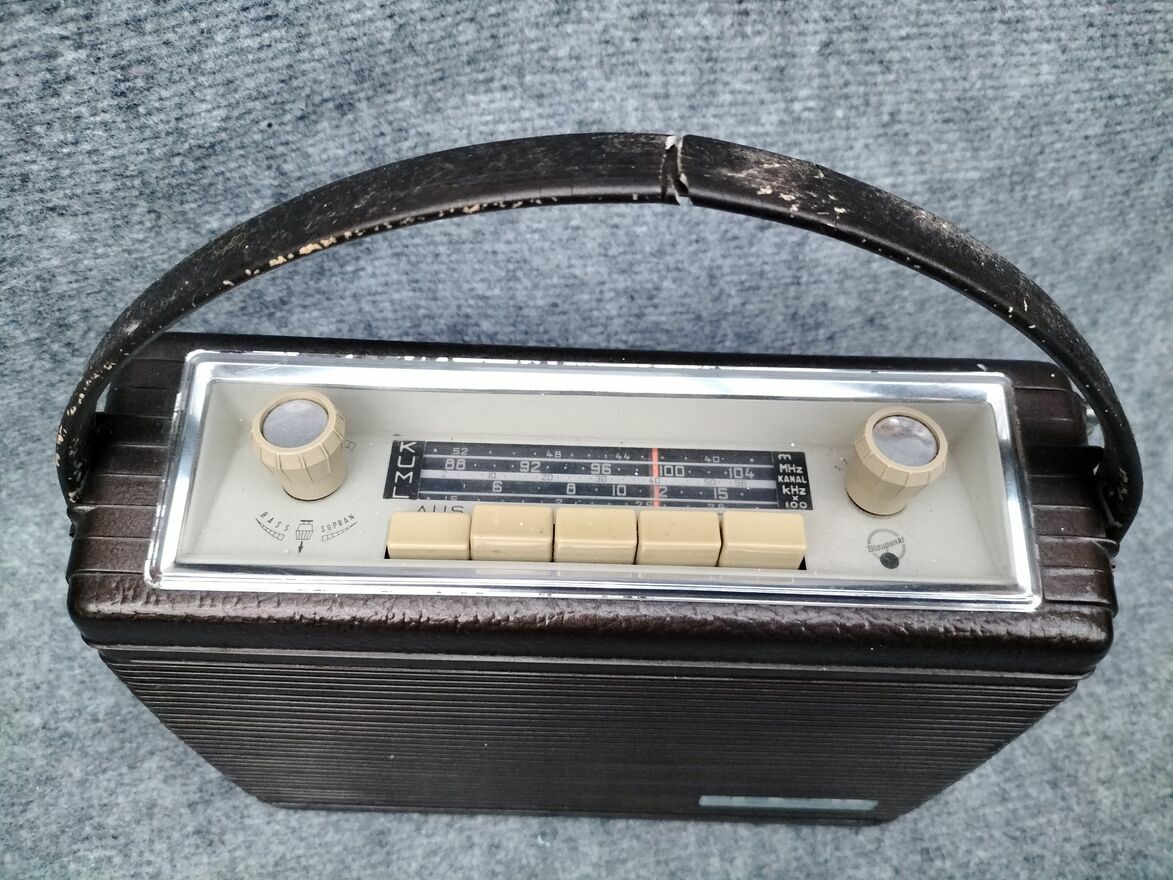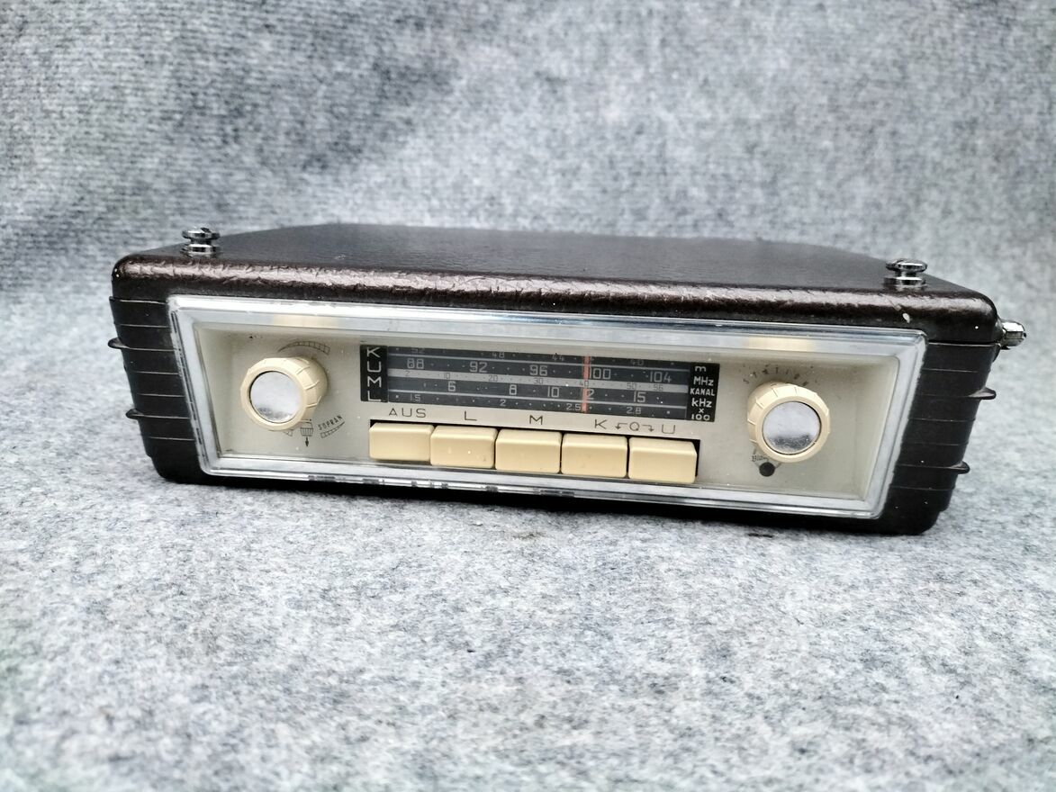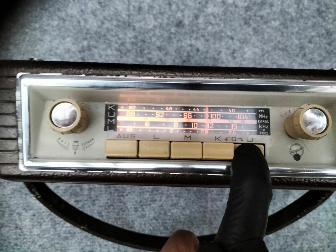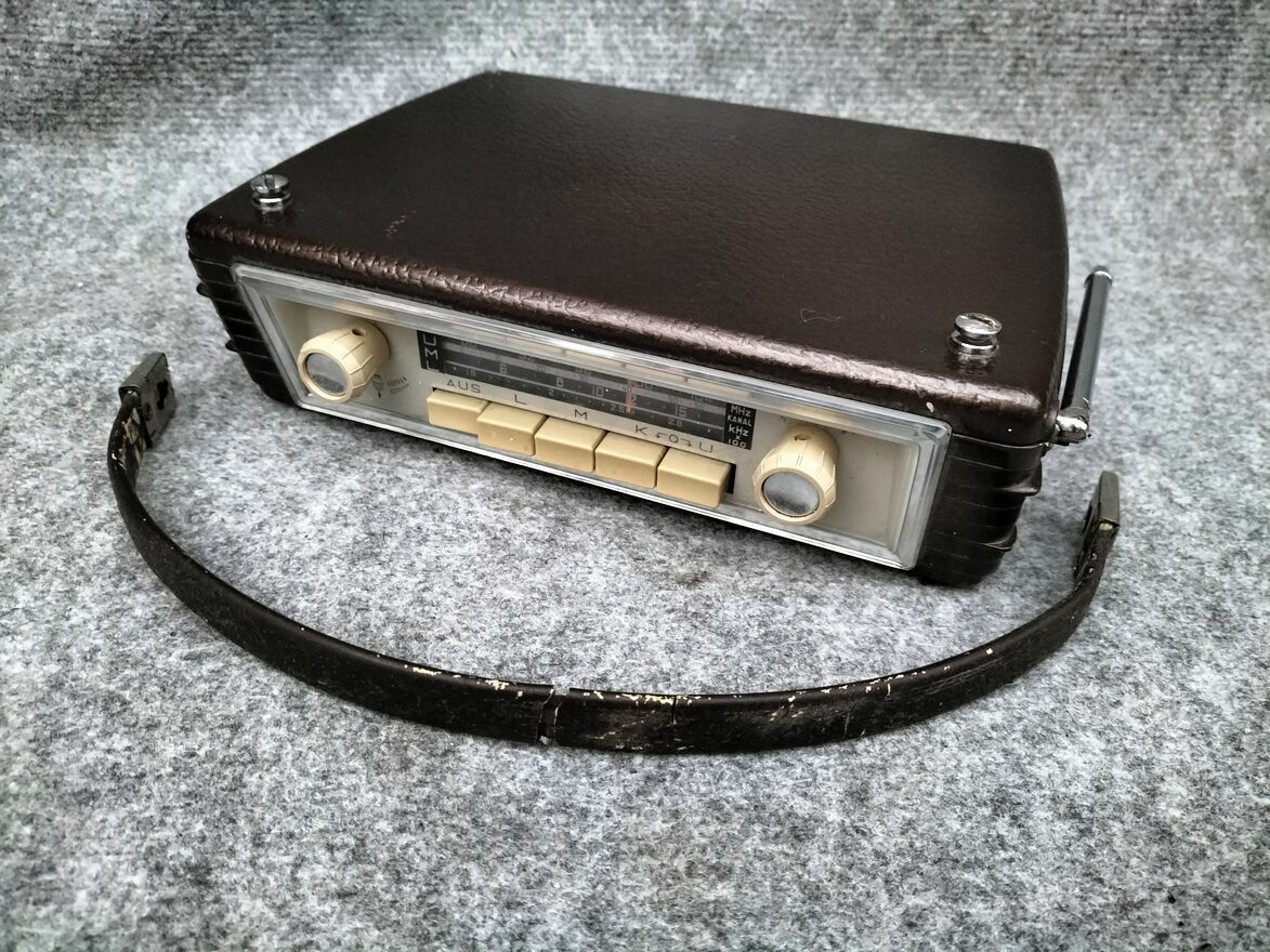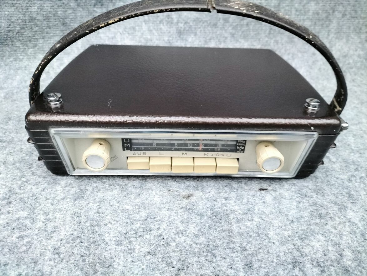 Stare przenośne radio samochodowe Blaupunkt Derby. Producent przewidział do tego modelu coś na wzór stacji dokującej uchwytu mocowania, która była opcją dodatkową przy zakupie i montowało się ją na stałe do auta. Dzięki temu " wpinało" się radio w to mocowanie ,uchwyt i było to wtedy radio samochodowe. Po przyjeździe wypinało się radio z uchwytu, mocowania i było to radio przenośne. Tak właśnie tę serię producent reklamował w tamtym okresie. Niestety nie posiadam takiego uchwytu , mocowania.Ogólny stan wizualny jak na swoje lata oceniam na bardzo dobry. Do zasilania radia służą baterie R20 ( 6 sztuk ).Radio gra.jest sprawne ,podświetlenie działa,antena cała, w zasobniku w tej chwili są baterie.