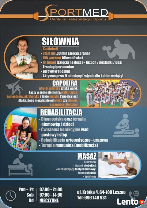 Sportmed zaprasza na rehabilitację dzieci i dorosłych, na zajęcia grupowe z fitness i nie tylko , na siłownie , treningi z Capoeira. Leszno ul. Krótka 4Sprawdź zainteresowanie tym ogłoszeniem