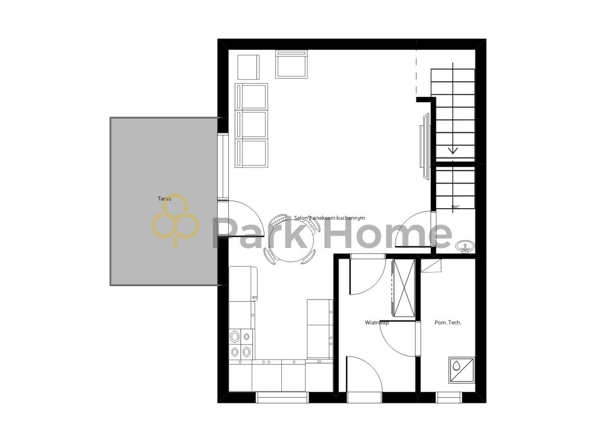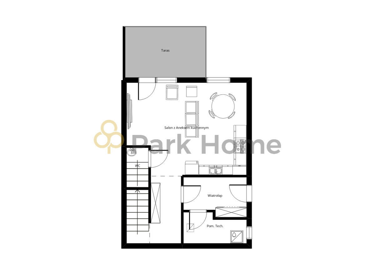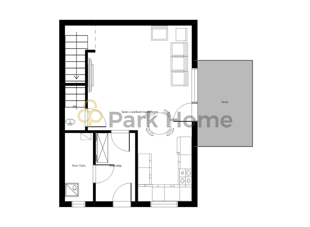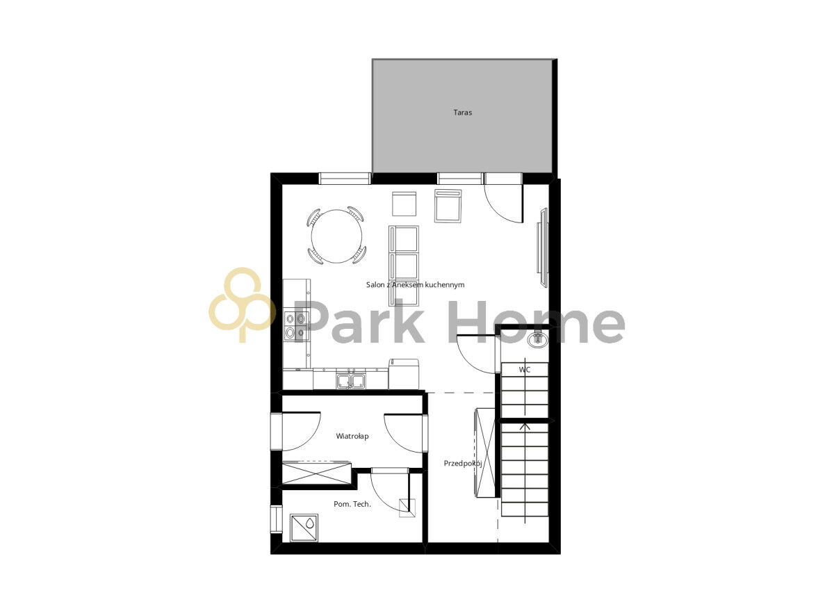 - przestronny salon z aneksem kuchennym,