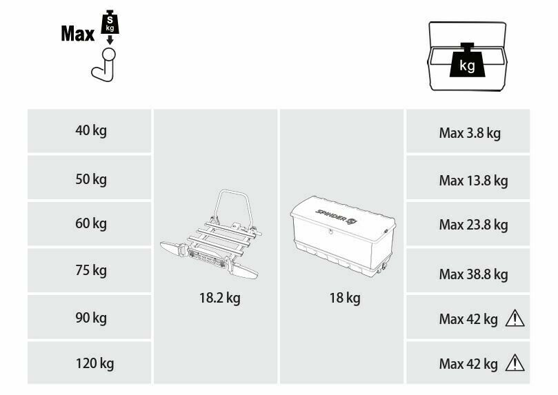 Przed montażem kufra/skrzyni/boxu Spinder BX1 należy sprawdzić maksymalne dopuszczalne obciążenie kuli. Można je znaleźć na tabliczce znamionowej haka holowniczego samochodu (w większości samochodów wynosi ono 75 kg). Całkowita masa Spinder BX1 + Spinder SB3/SL3 + zapakowane przedmioty nie mogą przekraczać maksymalnego dopuszczalnego obciążenia kuli haka holowniczego.