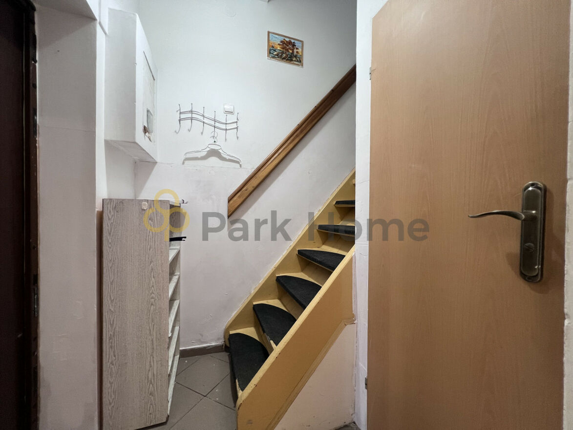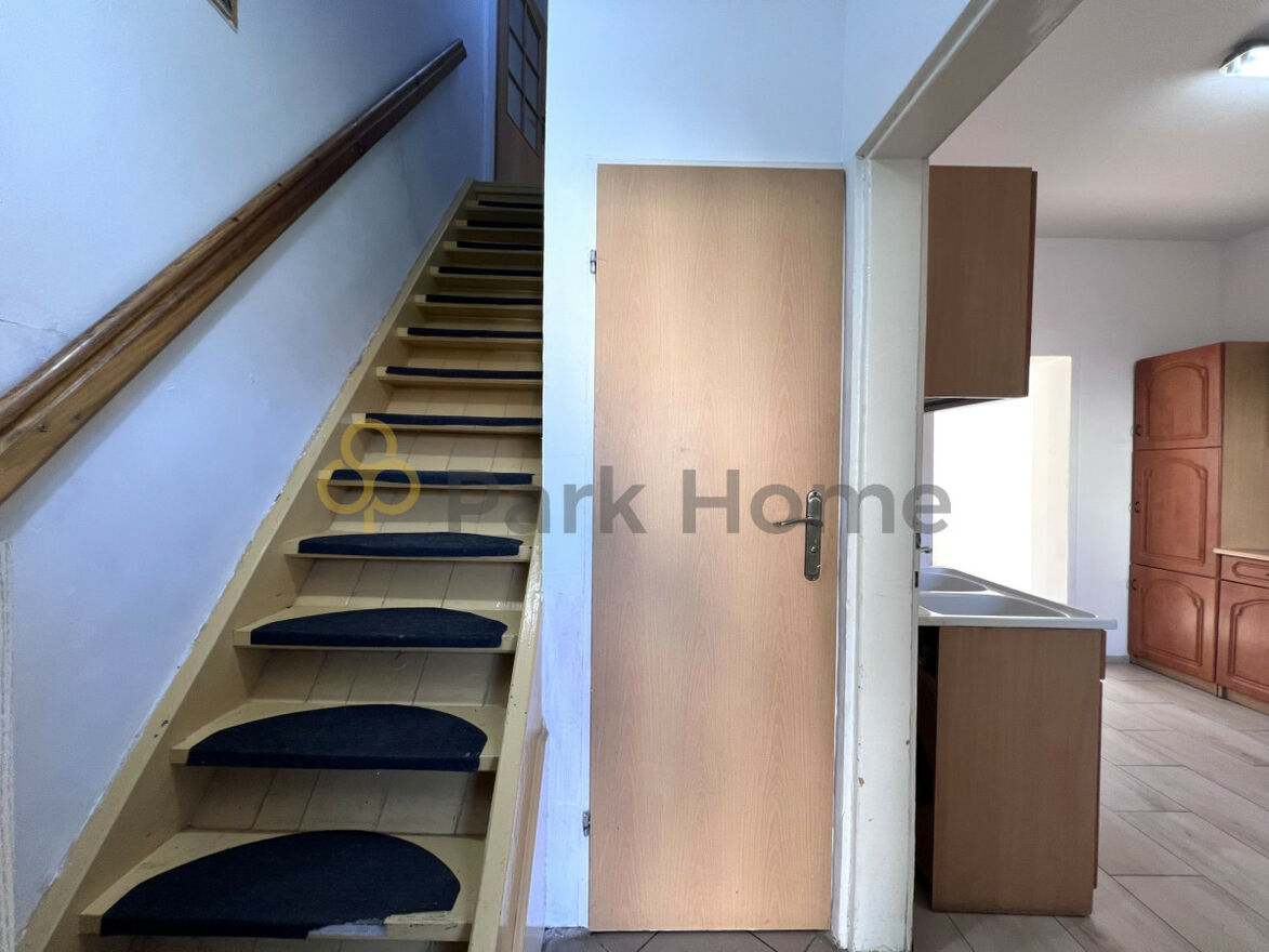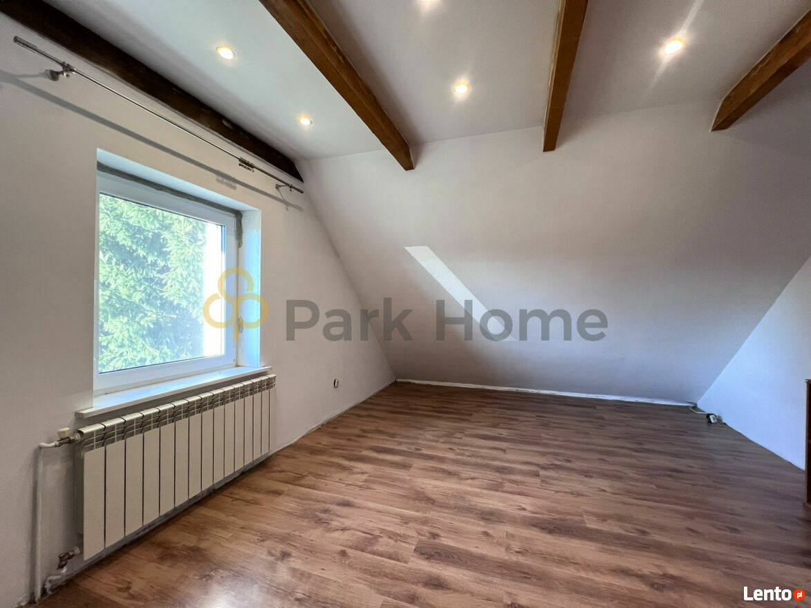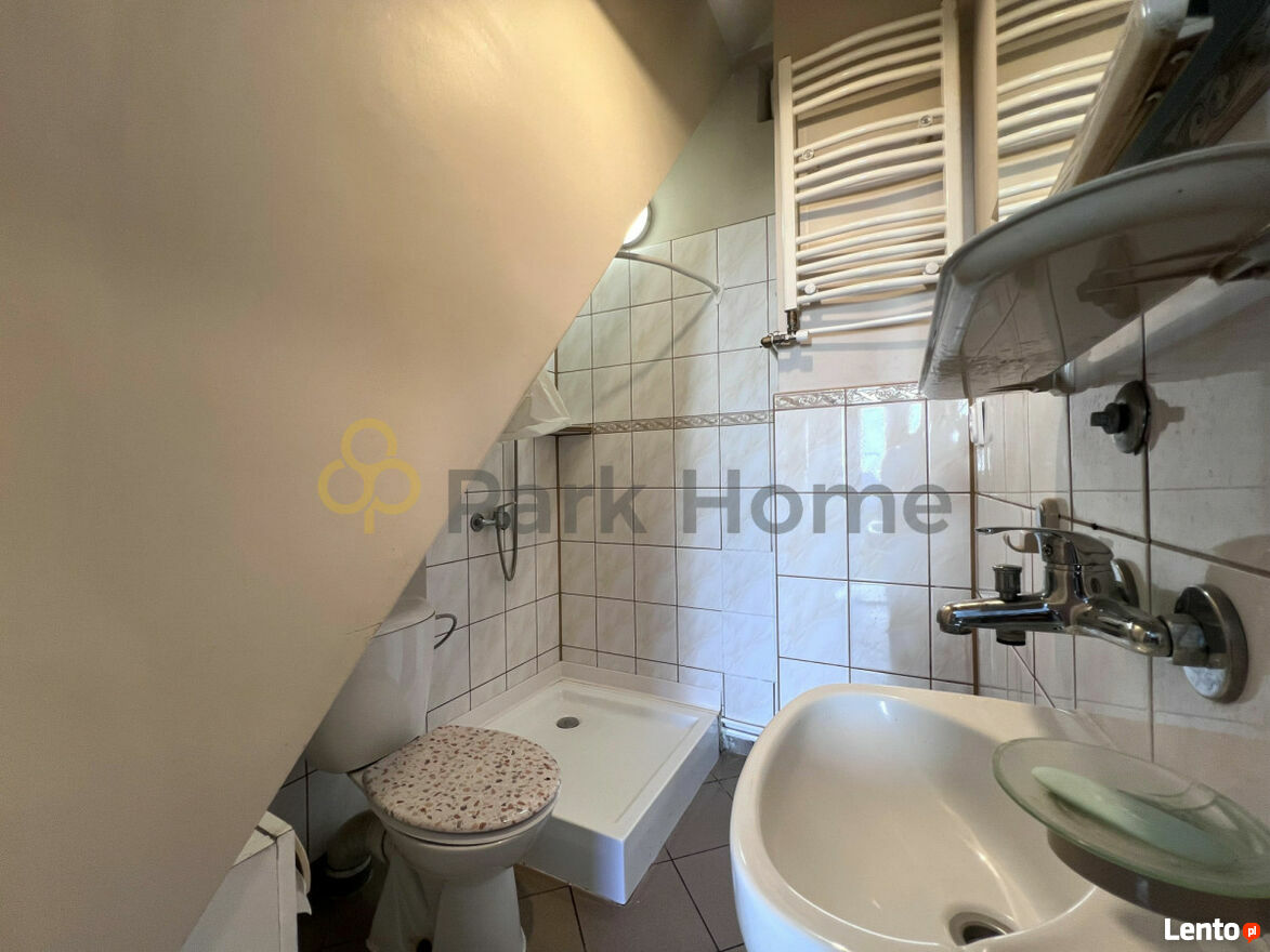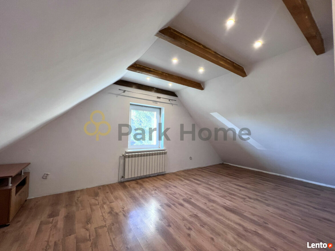 Widoczne na zdjęciach schody prowadzą na poddasze, gdzie znajduje się drugi pokój - świetnie sprawdzający się jako sypialnia, pokój dziecka lub gabinet.