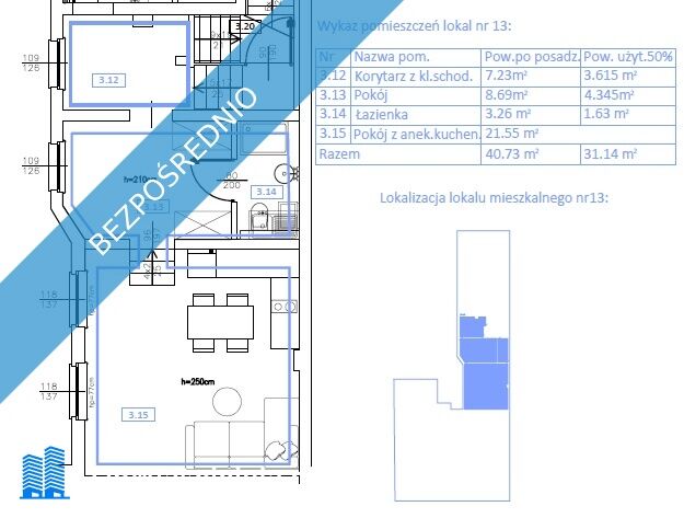 - powierzchnia 40,73 m2 po podłodze (powierzchnia użytkowa 31,14 m2)