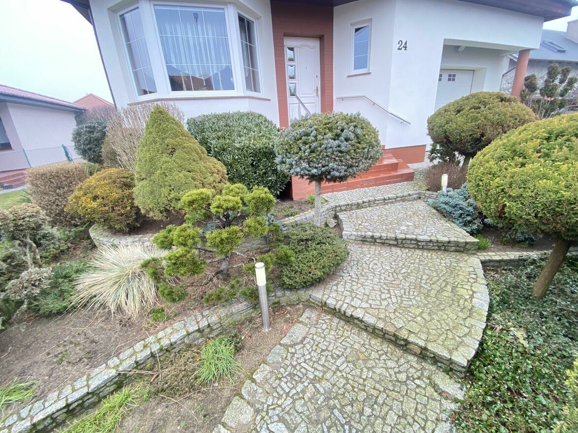 częściowo zadaszony taras, podjazd do garażu oraz wejście do budynku wyłożone brukiem, liczne nasadzenia krzewów.