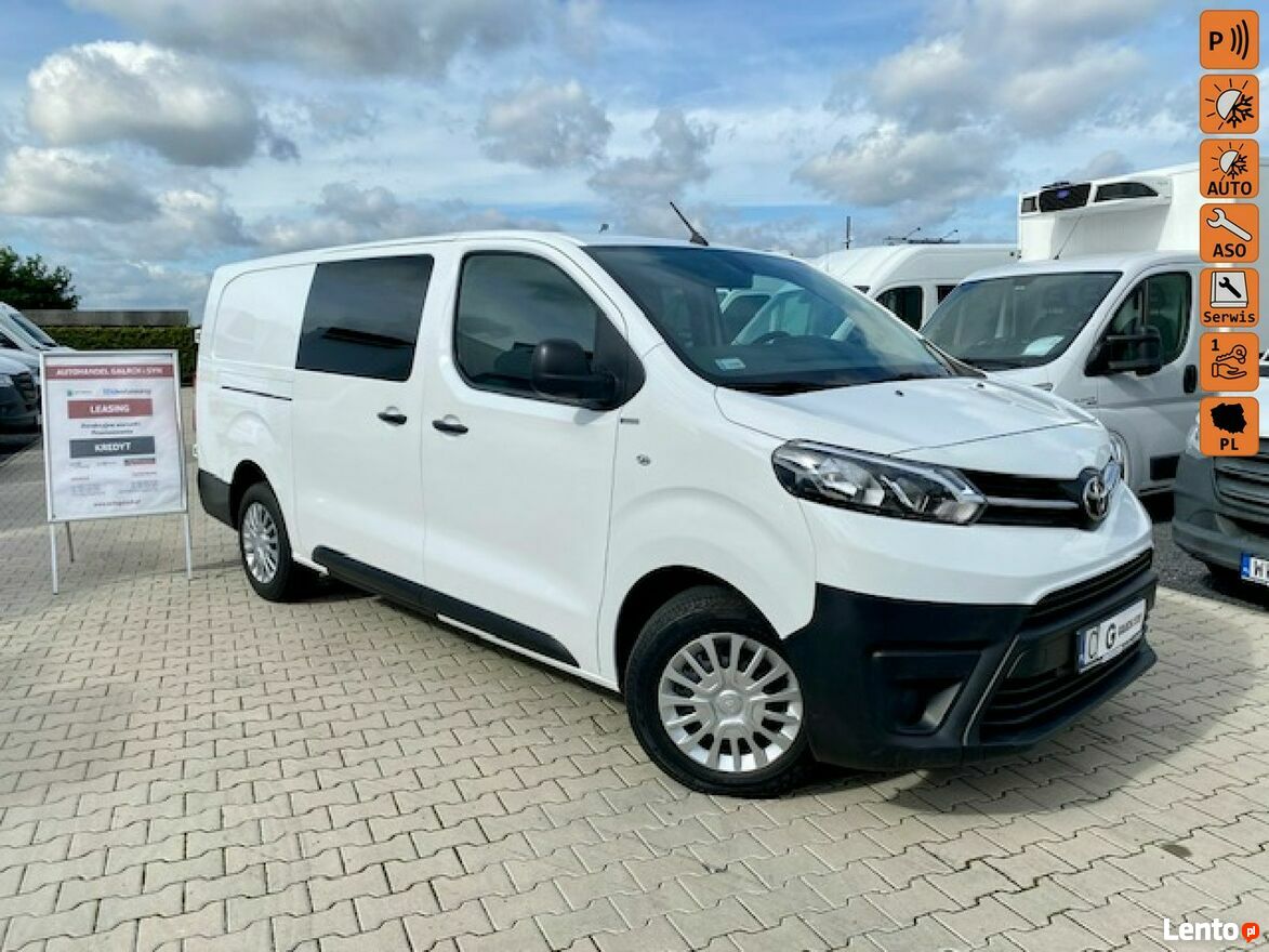 ZAKUPIONY I SERWISOWANY W POLSKIM SALONIE TOYOTA 3/2020, oryginalna zabudowa - DOKA 6-cio osobowa, 159 tys.km, silnik 2.0 - 122KM , wersja DŁUGA L2H1 , KLIMATRONIC , TEMPOMAT , ABS, ASR, ESP, kontrola trakcji, 3- osobowy , oryginalne radio + CD +MP3 + TEL + BLUETOOTH , kierownica wielofunkcyjna ze sterowaniem radia , 1 x airbag, elek. szyby, elek. podgrzewane lusterka, centralny zamek + pilot + alarm, duży komputer pokładowy, światła do jazdy dziennej , czujnik zmierzchu + czujnik deszczu, czujniki parkowania ,a termiczne przyciemniane zielone szyby , wspomaganie kierownicy, regulowana wysokość fotela kierowcy + podłokietnik , dzielone siedzenie pasażera - łamane z wnęką , część pasażerska wytapicerowana , część bagażowa wybita sklejką , fabrycznie wzmocnione zawieszenie tylne , koła 16 , system eco , system start-stop ,BEZWYPADKOWY , KSIĄŻKA SERWISOWA , SUPER STAN ,UWAGA : HOMOLOGACJA CIĘŻAROWA - PEŁEN ODPIS VAT-u 23%